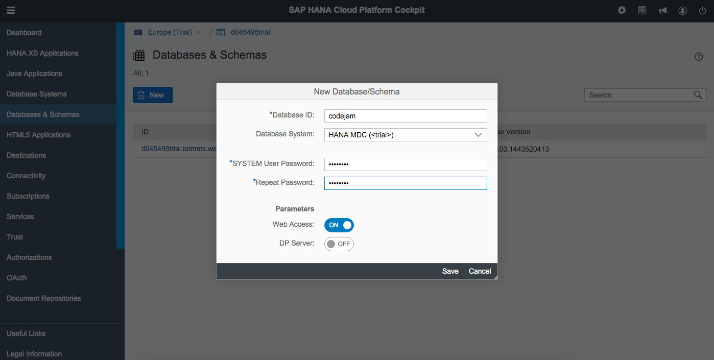 Choose Databases & Schemas. You will need to create your new instance, to do this simple give it a name, enable web access and of course give a password. This password you will need to remember as it is the password for your SYSTEM user and how you will be able to access the server.