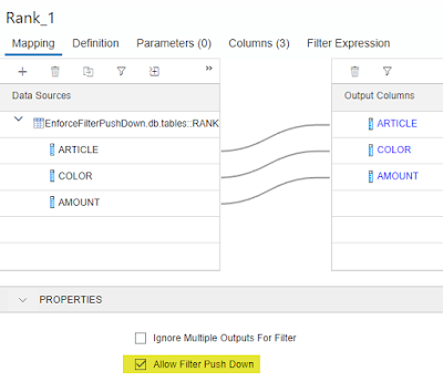 With HANA Data Modeling Tools SPS02 in SAP Web IDE two new flags were introduced that enforce the push-down of filters to lower nodes in specific situations in which filter push-down would not happen per default. One flag is available in Rank nodes. The other flag is available in all nodes but only has an effect if the respective node is consumed by more than one succeeding node.