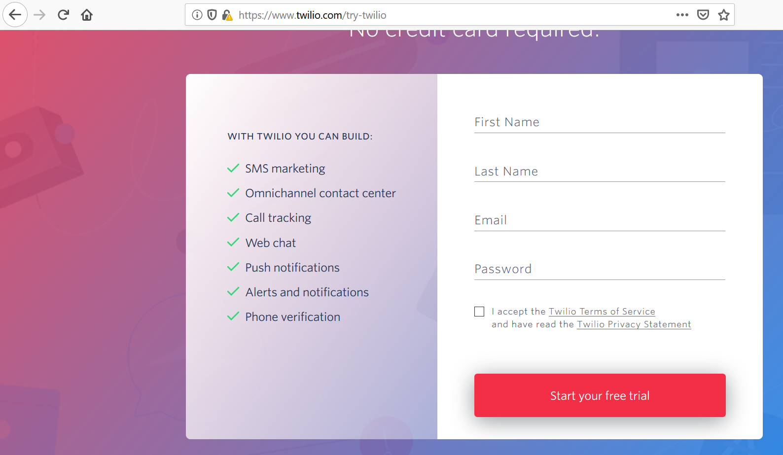 8. Create free account in twilio using this link, you can get free trial account where all the beta services are enabled. Registration process is quite straight forward.