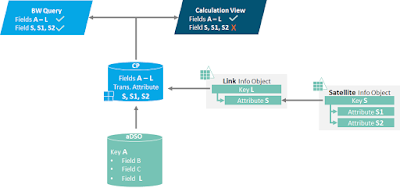 B) The link info object is associated in the composite proivder. In this case, however, the transitive navigation attributes of the satellites are only available on the BW side. The attributes are not available in the HANA-side CalcView.