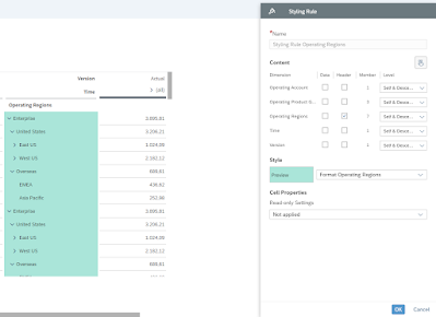 In the above two examples of ad-hoc styling, SAC’s table widget saves the context of applied formatting. Hence, even if the story designer changes the drill of the table, formatting of the header region and the dimension Operating Regions won’t be discarded! Also, technically speaking: only one styling rule will be generated for each applied formatting. Note, the usage of ad-hoc styles in combination with defined selection areas is an efficient way to style tables.