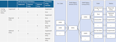 ◉ The field status is influenced by posting keys, specifications in the document, and the field status groups. For easy administration, SAP groups field statuses into field status groups (FSGs) that are defined in the company code area of each SAP G/L account. The FSG determines which fields are ready for input (Required Entry or Optional Entry) and which are hidden (Suppressed) during document entry. You can’t enter an FSG in the customer or vendor accounts because it’s determined from their respective reconciliation accounts via the SAP G/L account number in their master records.